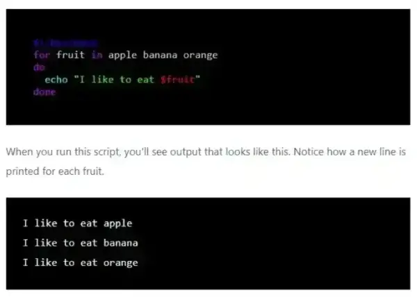 In the following example, the for command is used in a bash script to iterate over a list of three common fruits (apple, banana, and orange) and assigning each one to the fruit variable. For each fruit in the list, the echo command is used to print a message to the screen that includes the fruit name.
